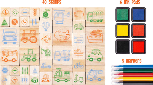EDUCATIONAL COLOURS WOODEN STAMP SET 51PC THINGS THAT GO